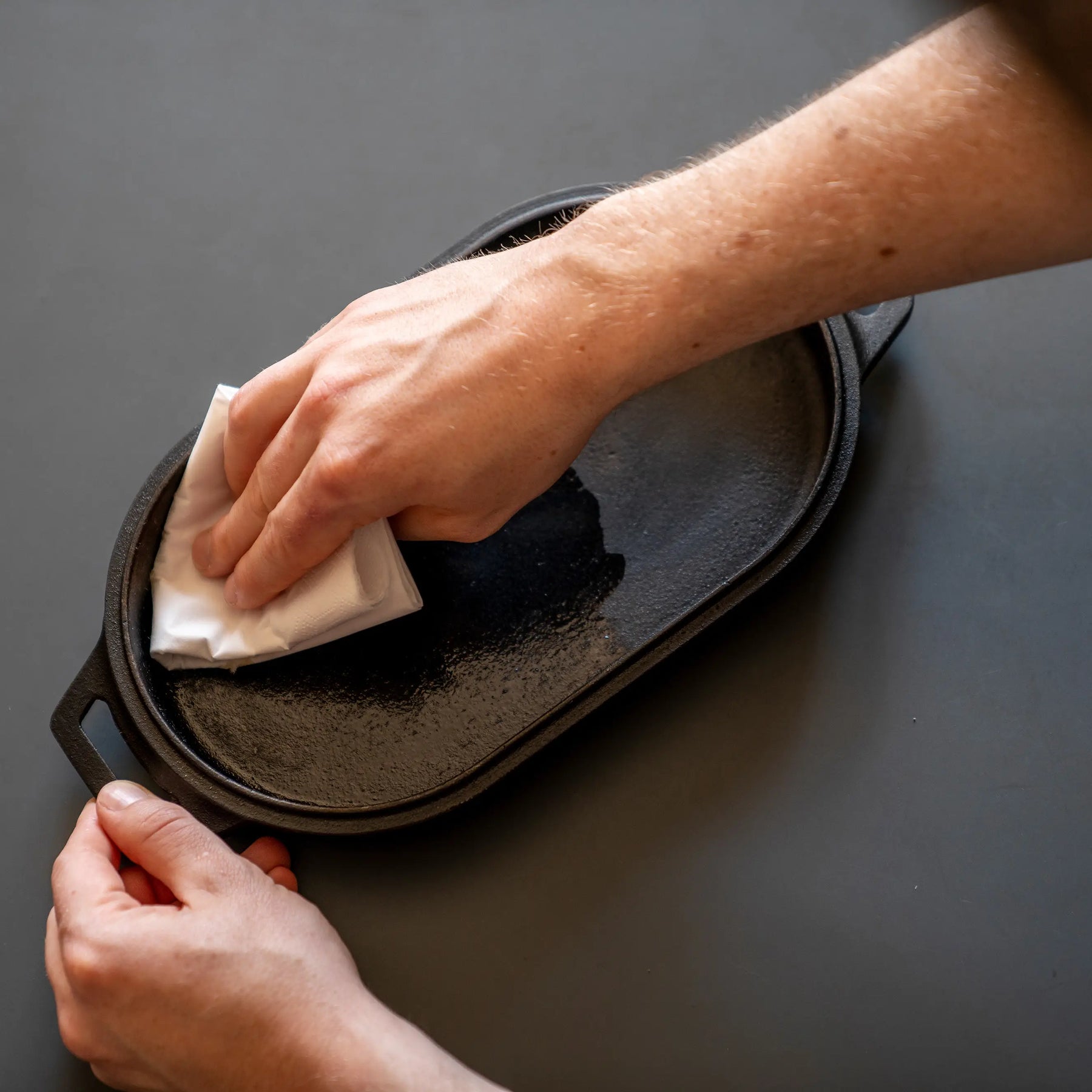 Nur von Hand mit warmem Wasser reinigen – nicht in die Spülmaschine geben. Nach dem Reinigen gründlich abtrocknen und dünn mit Öl einreiben, um die natürliche Antihaft-Patina zu pflegen. Die Sizzler Pan ist bereits vorbehandelt (seasoned) und sofort einsatzbereit. Weitere Pflegetipps findest du im beiliegenden Essentials Guide.
