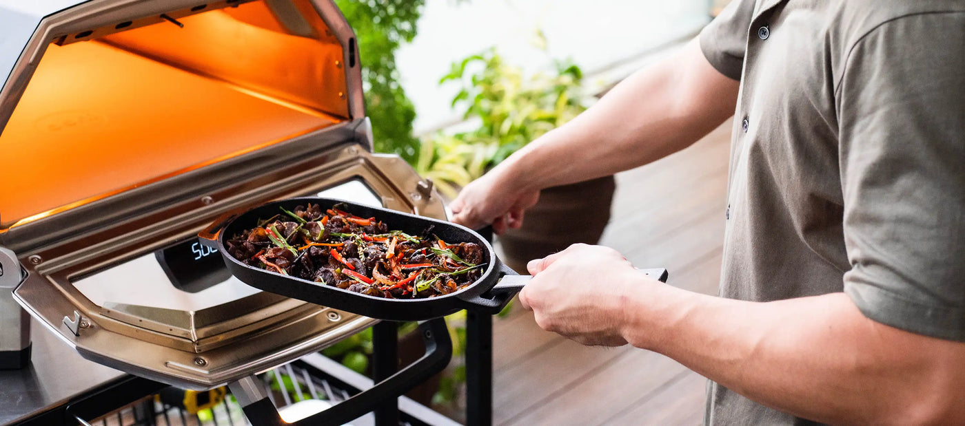Die Ooni Sizzler Pan ist vielseitig nutzbar: im Ooni Pizzaofen, in herkömmlichen Backöfen, auf Elektro-, Gas- und Induktionsherden sowie direkt über offener Flamme oder auf dem Grillrost. Beim Verschieben auf Induktionsplatten bitte anheben, um Kratzer zu vermeiden. Ideal für Fleisch, Fisch, Gemüse und Beilagen – vom Garen bis zum stilvollen Servieren.