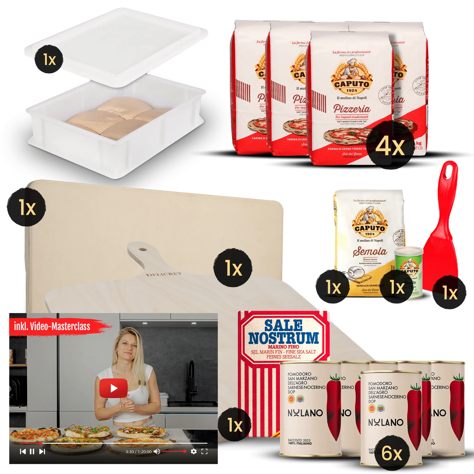 Pizzastein für Backofen 33x38cm + Starter-Kit mit Caputo Pizzamehl, Semola, Hefe, Nolano San Marzano DOP Tomaten, Salz, Box & Rezept – Für echte Pizza Napoletana zuhause!