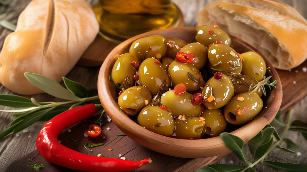 Tenute Seidita - 250g - Grüne Oliven gewürzt nach bäuerlicher Art mit Chili, Knoblauch, Oregano, Fenchel